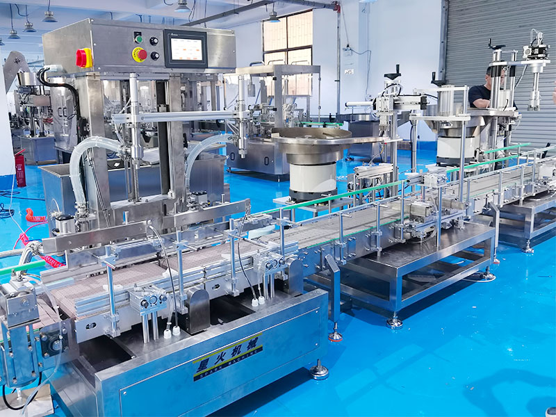 直線式稱重灌裝生產主要由PLC控制系統逐一調度生產模式,其中的各個環節都通過傳感器與執行器實現無縫銜接的灌裝優勢,工人將所需灌裝的容器放置在輸送帶上,輸送裝置將容器分布送至各個灌裝工位的灌裝頭下方,光電感應控制則會實時檢測容器口位置,并將其固定,伺服電機則會精準的控制灌裝頭的位置標準,在進入灌裝區域后,直線式稱重灌裝生產線的PLC啟動灌裝閥,由此開始進行先快加后慢加的工作條件,在達到設定的重量后,灌裝閥自動關閉,完成生產任務,隨后上蓋機將會跟隨容器位置進行自動上蓋、旋轉扭矩將其旋緊的工作狀態。