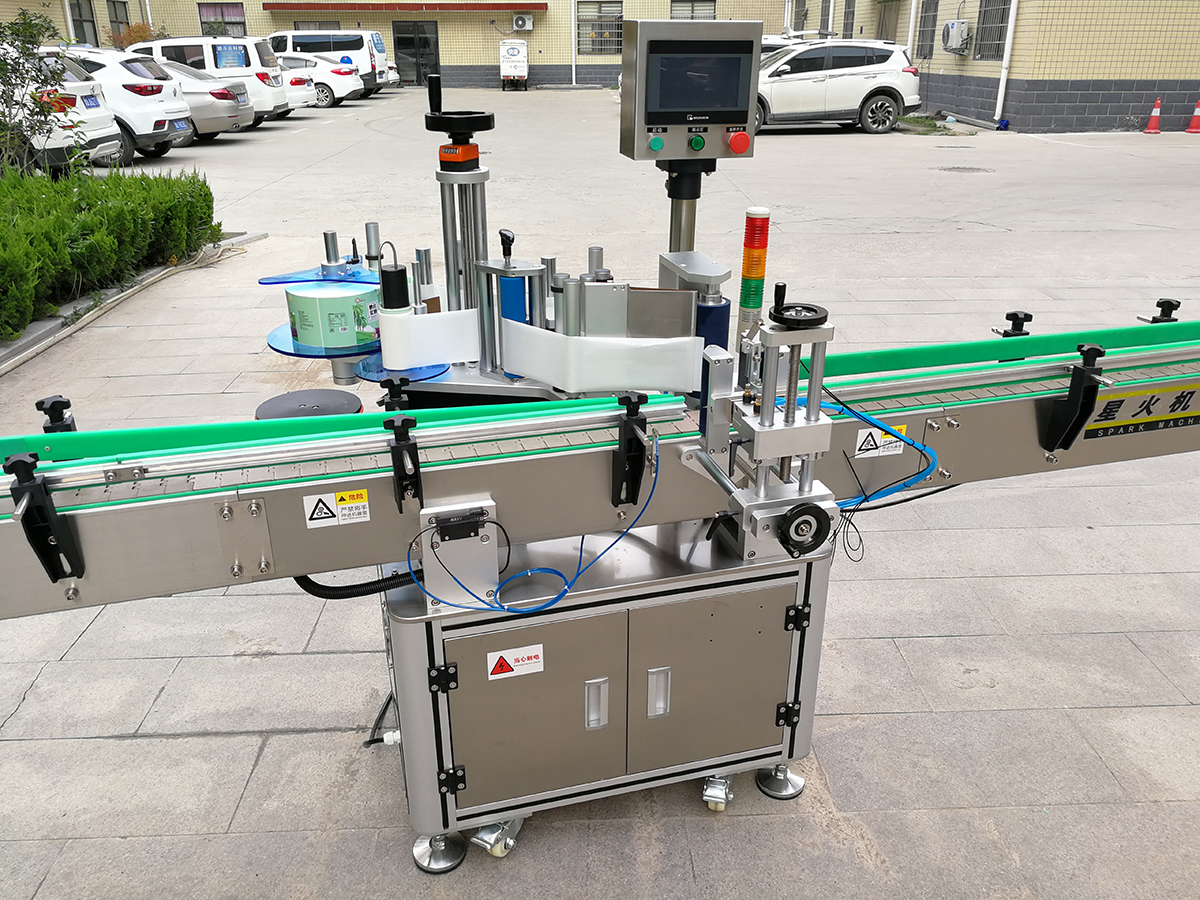 核心工作原理:放產品到輸送帶,進入分瓶機構,分瓶機構將產品分開后,傳感器檢測到產品經過,傳回信號到貼標控制系統,在適當位置控制系統控制相應電機送出標簽并貼附在產品待貼標位置上,同時覆標,一張標簽的貼附動作完成。