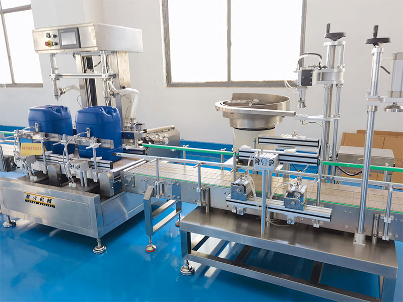 全自動(dòng)稱重式灌裝機(jī)械的核心工作方式,主要是以重量定體積,以此不受物料密度、溫度、粘度變化影響,以此確保灌裝精度的統(tǒng)一性,工作人員在18公斤稱重灌裝機(jī)的顯示屏幕內(nèi)設(shè)定好灌裝參數(shù)規(guī)格,輸送帶會(huì)將空的容器桶送至灌裝工位,氣動(dòng)擋桶機(jī)構(gòu)于定位裝置會(huì)在協(xié)同的作用下將其卡定在下料處,稱重傳感裝置將實(shí)時(shí)檢測空桶內(nèi)的重量信息,并將灌裝的數(shù)據(jù)反饋至PLC控制系統(tǒng)內(nèi),自動(dòng)進(jìn)行記錄并扣除桶重,灌裝閥在開啟的那一刻,按雙速灌裝模式進(jìn)行物料輸送,當(dāng)達(dá)到慢灌閾值時(shí),PLC控制灌裝閥切換流量,當(dāng)重量達(dá)到18公斤設(shè)定值時(shí),立即關(guān)閉灌裝閥,完成灌裝。